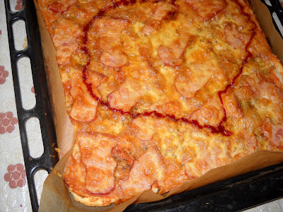 Ete ca azi a venit un prieten pe la noi si am zis sa fac ceva de papa, ca doar nu puteam sa las omul asa... pe uscat. Si uite-asa a iesit o pizza cu paine. Am facut-o cu miez de paine pentru ca nu-mi iese niciodata cu blat. Asa ca am aplicat metoda mamei si am "inventat" eu blatul.